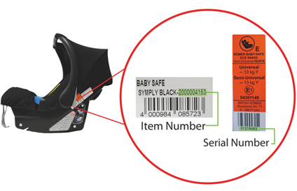Ponte en contacto con nuestro servicio de atención al cliente. Te pedirán el número de artículo y el número de serie. Las pegatinas con el número de artículo y el número de serie están situadas a la izquierda del portabebés (en el sentido de la marcha del niño), detrás de la bisagra del asa.