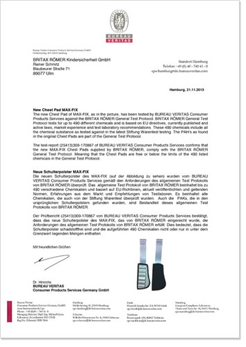 En los últimos resultados de pruebas publicados por Stiftung Warentest en Alemania se han probado 16 sillas infantiles de ocho fabricantes distintos, junto con el club automovilístico alemán ADAC. En estos resultados de pruebas, Britax MAX-FIX (Grupo 0+/1; desde el nacimiento hasta los 18 kg) recibió buenas puntuaciones en Seguridad y Manejo/Ergonomía, pero obtuvo una nota general de insuficiente (5,5) debido a las sustancias potencialmente dañinas que se encontraron.